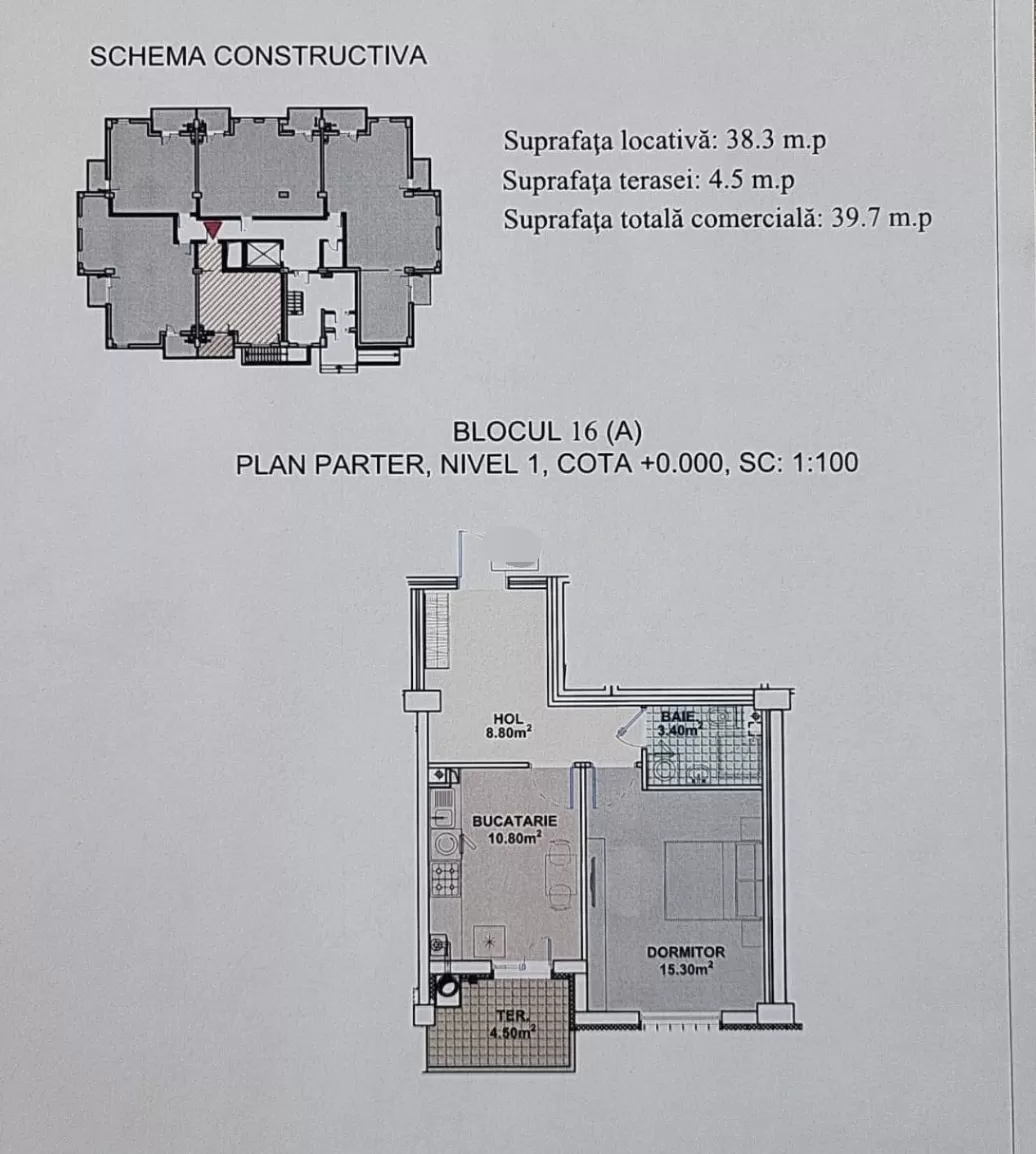Suprafata apartamentului : 39,7 mp (apartamentul 38,3 mp + 4,5 mp terasa)