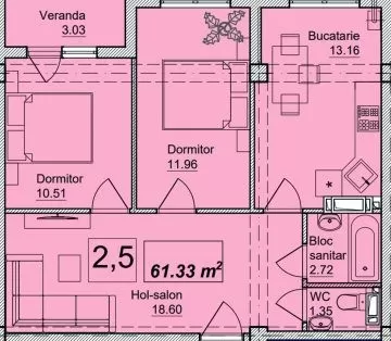Compartimentare: bucătărie, 2 dormitoare, antreu comasat cu living, 2 blocuri sanitare, balcon deschis.