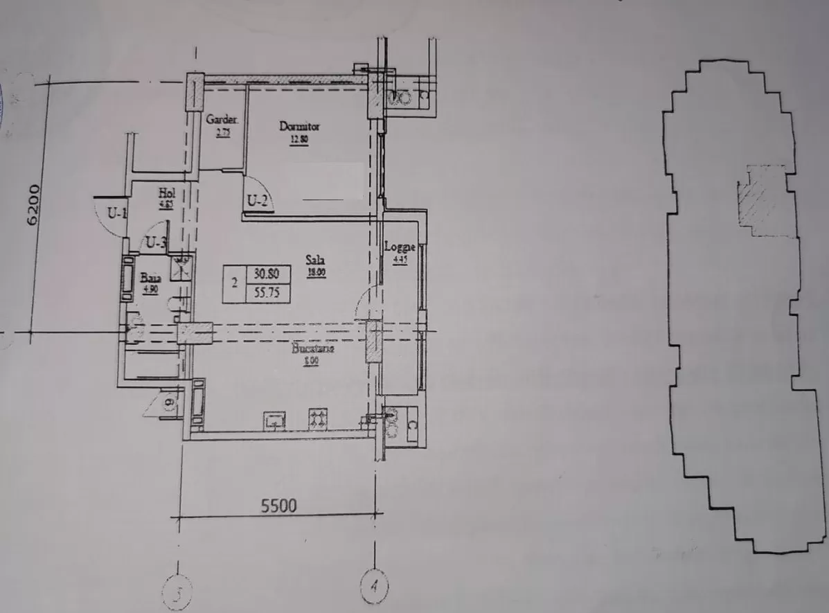 Compartimentare: hol, 1 dormitor, bucătărie cu living, bloc sanitar, logie, garderobă.
