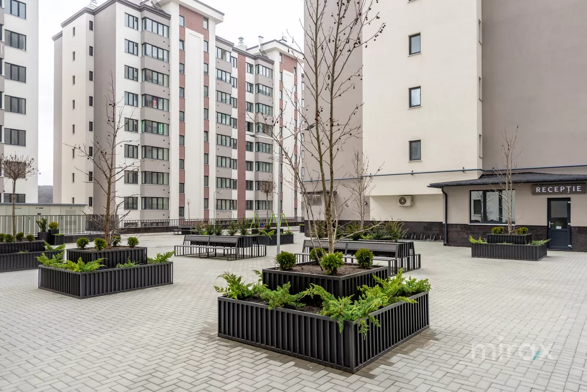 Curtea complexului este amenajată cu teren de joacă pentru copii, pază și supraveghere video 24/24.